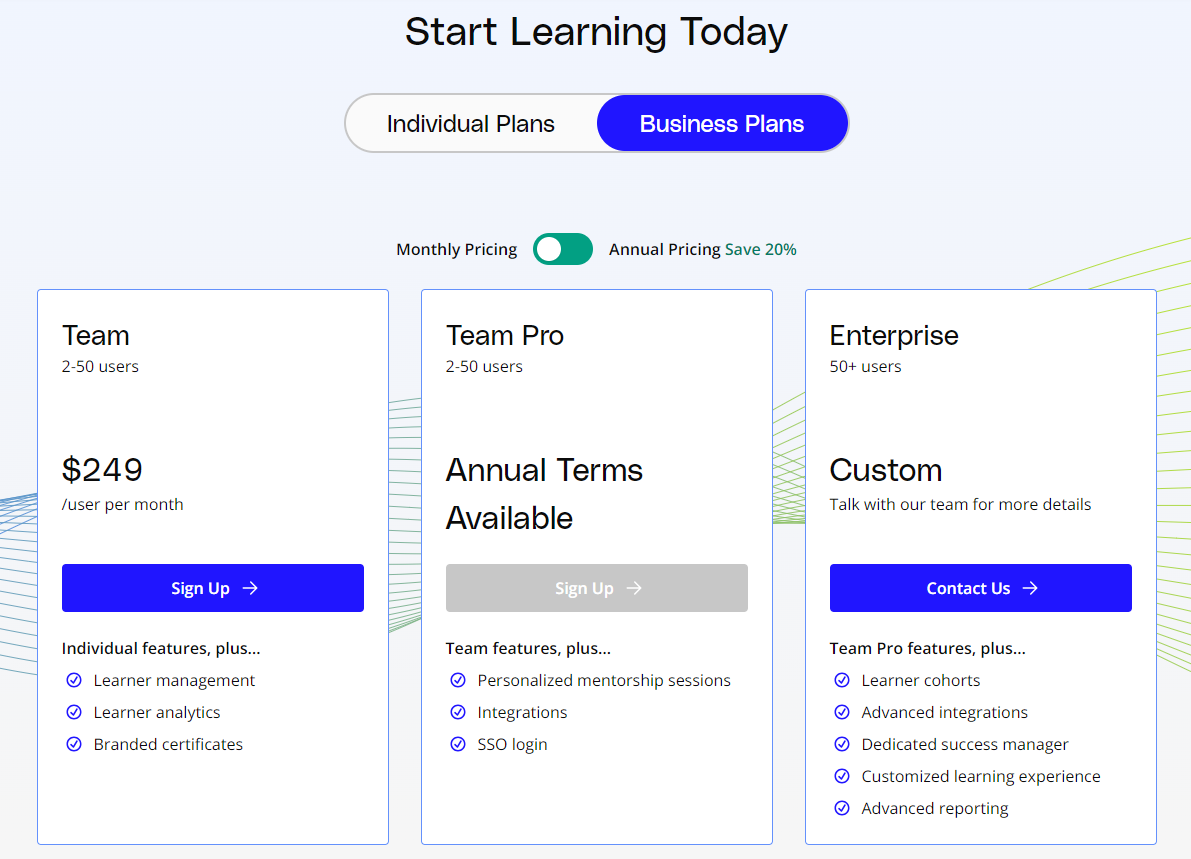 • Team: Udacity offers Team plans for businesses that want to provide their employees with access to Udacity’s courses and Nanodegree programs. These plans start at $2,995 per month.
